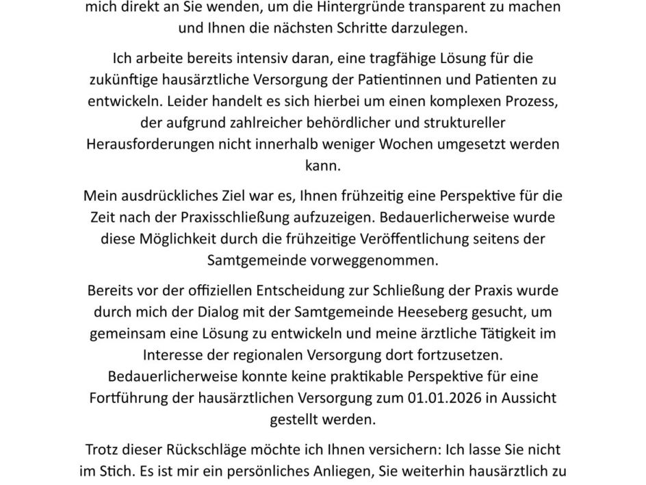 Die Samtgemeinde veröffentlicht auf Wunsch von Frau Kramer folgende Stellungnahme, macht sich die darin enthaltenen Argumente und Herleitungen jedoch nicht zu eigen. Die Samtgemeinde wird weiterhin gemeinsam mit dem Vermieter der Praxis vor Ort an einer Lösung arbeiten.